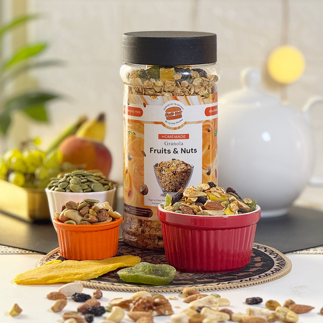 INGREDIENTS Rolled OatsDried MangoDried KewiCashew Nuts Almond Pumpkin Seeds Black Raisins Coconut OilBrown Sugar (shakkar)Cinnamon powder...............................................Benefits: Granola is...