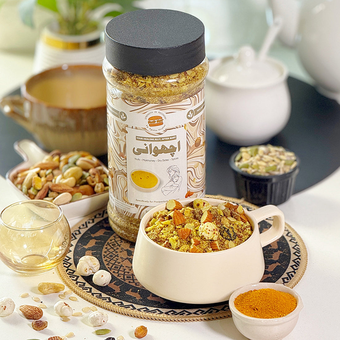 INGREDIENTS: Desi Ghee Dates GranolaNUTS: Pistachio Cashew Nuts Almond WalnutSEEDS: Flaxseeds Pumpkin Seeds Melon Seeds...